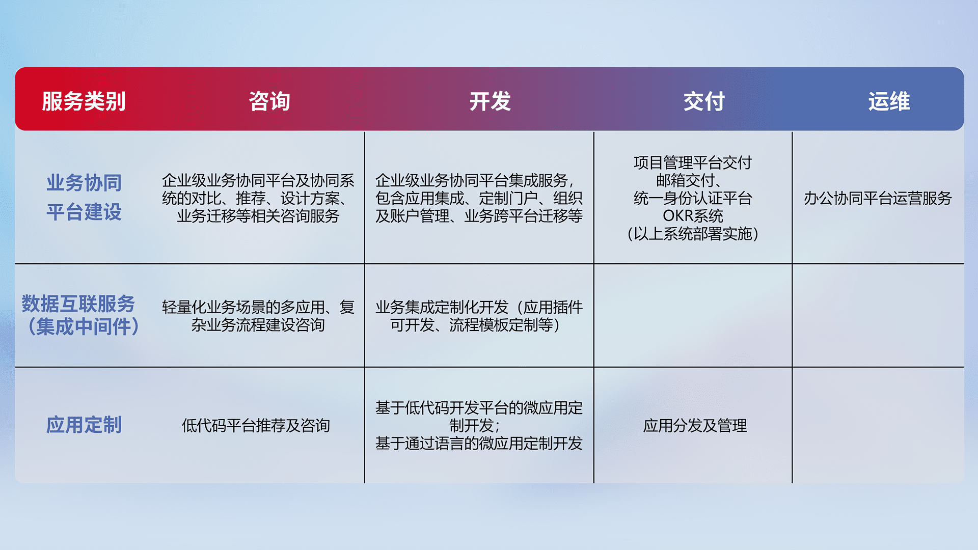针对钉钉、、、、企微、、、、IDaas等平台级产品提供产品的规划、、、、方案、、、、交付、、、定制化开发等服务,,,,实现如统一协同办公、、智能客户服务、、、、混合会议管理、、、、智能数据查询、、、等业务场景,,实现数字化转型。。。